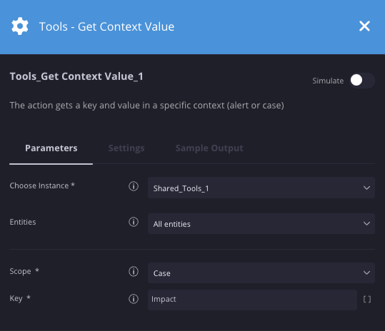 In this scenario, we're retrieving a context value from a key called impact in a case. This action is used along with the Set Context Value action that adds the key value pairs to the case or alert.