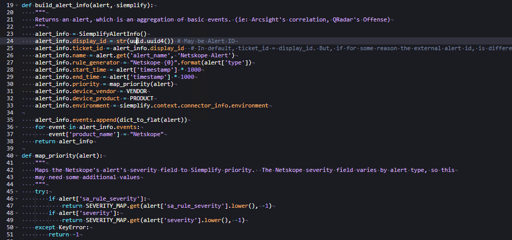 display_idrecebe um valor gerado aleatoriamente usando a bibliotecauuid. Os alertas do Netskope não fornecem um campo UUID, mas, se um estivesse disponível, ele poderia ser usado.ticket_idestá definido para corresponder adisplay_id. Os dois campos precisam ser exclusivos por alerta no sistema. Essa exclusividade é garantida pela geração de um UUID aleatório.nameé o nome do alerta e será exibido na GUI.rule_generatorse refere à regra que gerou o alerta no sistema de origem. Esse campo nem sempre está presente nos dados brutos. Se ele estiver faltando, você poderá atribuir qualquer valor de string, mas não deixe o campo em branco.start_timeeend_timerepresentam os carimbos de data/hora do alerta. Neste exemplo, o alerta do Netskope fornece um carimbo de data/hora da época Unix, que precisa ser multiplicado por 1.000 para ser convertido em milissegundos. Esse é o formato esperado para o Google SecOps. Se a fonte usar um formato diferente, será necessário fazer a conversão. Consulte o móduloSiemplifyUtils.pypara métodos úteis de conversão de tempo.priority: o aplicativo Google SecOps atribui uma prioridade a cada caso com base na prioridade do alerta. A API Google SecOps mapeia valores numéricos para os rótulos visuais usando o seguinte esquema, em que o valor inteiro é transmitido no conector:{"Informative": -1, "Low": 40, "Medium": 60, "High": 80, "Critical": 100}, em que o valor inteiro é o que é transmitido no conector. Por exemplo, transmitir "100" marca o alerta como Crítico na GUI. Nesse conector, uma função auxiliar adicional mapeia os valores de gravidade do Netskope para essa escala de prioridade usando a constante "SEVERITY_MAP". No entanto, como os campos de gravidade do Netskope são inconsistentes, o mapeamento exige uma lógica extra para avaliar vários campos.device_vendoredevice_productrecebem valores de constantes definidas anteriormente no script.environmenté essencial ao usar vários ambientes no Google SecOps. Nesse caso, ele vem do objetosiemplifye se alinha ao ambiente selecionado para o conector na plataforma.- Na linha 37 (Figura 3), o conector modifica o dicionário de eventos básicos