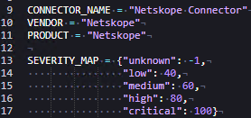 display_id使用uuid库分配一个随机生成的值。Netskope 提醒不提供 UUID 字段,但如果提供,则可以改用该字段。ticket_id设置为与display_id匹配。 这两个字段在系统中的每个提醒中都必须是唯一的。通过生成随机 UUID 来确保唯一性。name是提醒名称,将显示在 GUI 中。rule_generator指的是在源系统中生成相应提醒的规则。此字段可能并不总是出现在原始数据中。如果缺少此属性,您可以分配任何字符串值,但不得将其留空。start_time和end_time表示相应提醒的时间戳。在此示例中,Netskope 提醒提供的是 Unix 纪元时间戳,必须将其乘以 1000 才能转换为毫秒。这是 Google SecOps 的预期格式。如果来源使用其他格式,您必须进行转换。如需有用的时间转换方法,请参阅SiemplifyUtils.py模块。priority:Google SecOps 应用会根据每个案例的提醒优先级为其分配优先级。 Google SecOps API 使用以下方案将数值映射到可视化标签,其中整数值在连接器中传递:{"Informative": -1, "Low": 40, "Medium": 60, "High": 80, "Critical": 100},其中整数值是在连接器中传递的值。 例如,传递 `100` 会在界面中将相应提醒标记为严重。在此连接器中,一个额外的辅助函数使用 `SEVERITY_MAP` 常量将 Netskope 的严重程度值映射到此优先级范围。不过,由于 Netskope 的严重程度字段不一致,因此映射需要额外的逻辑来评估多个字段。device_vendor和device_product的值来自脚本中之前定义的常量。- 在 Google SecOps 中使用多个环境时,