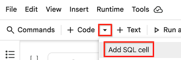 在工具栏中,如需添加 SQL 单元格,请点击 插入代码单元格选项菜单,然后选择添加 SQL 单元格。