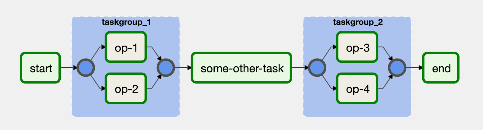 In this workflow, tasks op-1 and op-2 run together after the initial