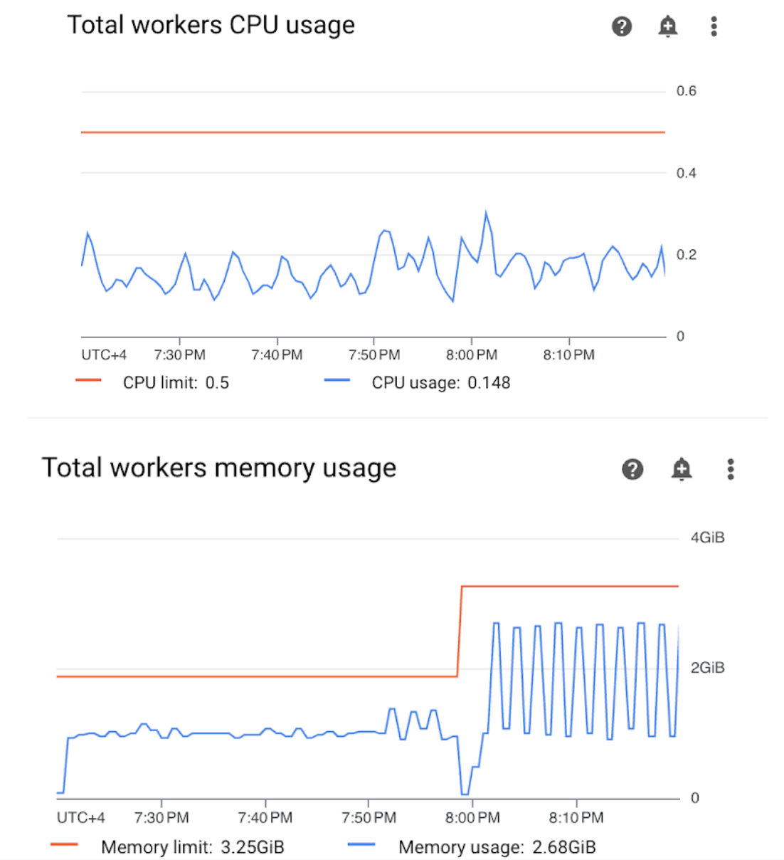 Figure 4 : métriques sur l'utilisation du processeur et de la mémoire des nœuds de calcul (cliquez pour agrandir) Le graphique "Utilisation totale du processeur des nœuds de calcul" indique que l'utilisation du processeur des nœuds de calcul est toujours restée en dessous de 50 % de la limite totale disponible. Le processeur disponible est donc suffisant. Le graphique "Utilisation totale de la mémoire des nœuds de calcul" montre que l'exécution de l'exemple de DAG a entraîné le dépassement de la limite de mémoire pouvant être allouée, qui équivaut à près de 75 % de la limite de mémoire totale indiquée dans le graphique (GKE réserve 25 % des quatre premiers Gio de mémoire et 100 Mio de mémoire supplémentaires sur chaque nœud pour gérer l'éviction des pods).