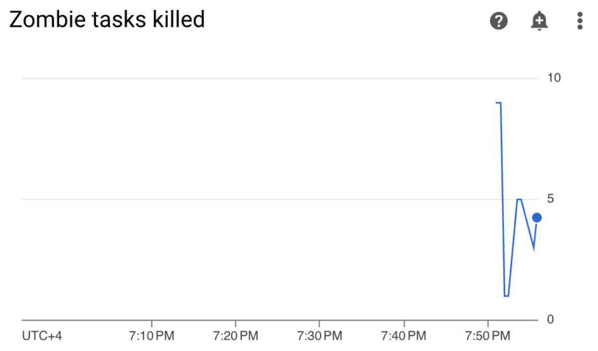 Selon les benchmarks et les actions correctives, la raison la plus courante des tâches zombies est le manque de mémoire ou de processeur du nœud de calcul. Identifiez la cause racine des tâches zombies en analysant l'utilisation des ressources de vos workers.