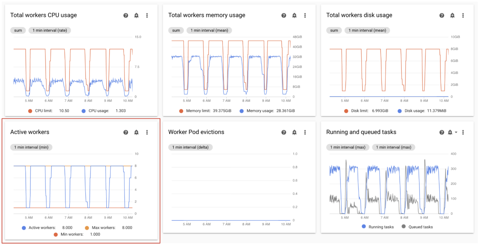 Beobachten Sie im Monitoring-Dashboard im Abschnitt Worker die Diagramme für die Anzahl aktiver Worker und die Anzahl der Aufgaben in der Warteschlange: