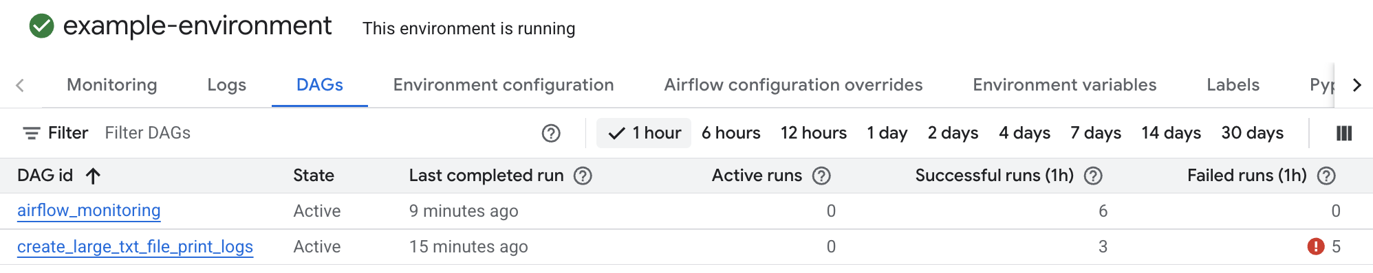 create_large_txt_file_print_logsDAG가 지난 1시간 동안 여러 번 실행에 실패했음을 알 수 있습니다. DAG 이름을 클릭합니다.