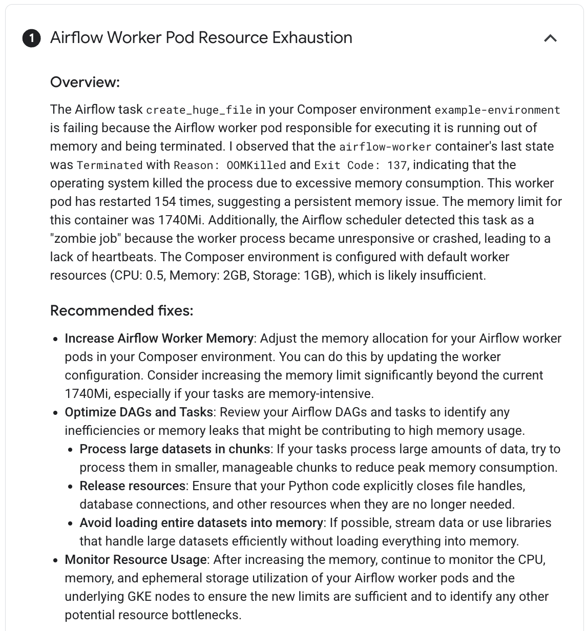 그림 4. 좀비 작업 감지 관찰(확대하려면 클릭) 마지막으로 Gemini Cloud Assist는 조사 결과를 요약하고 문제 해결을 위한 추천과 함께 가설을 제공합니다. 이 예시에서는 Airflow 작업자에 작업을 처리할 리소스가 충분하지 않아 작업이 실패했습니다. 이는 작업자 포드가 OOM 오류로 여러 번 다시 시작되고 태스크가 스케줄러에 의해 좀비 태스크로 종료되는 관찰 결과로 뒷받침됩니다.