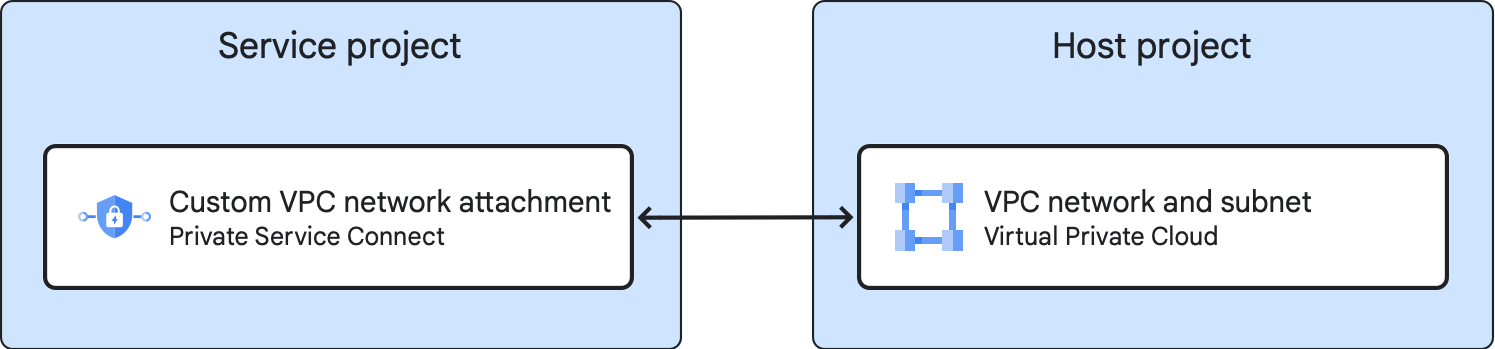 - サービス プロジェクトにネットワーク アタッチメントを作成し、共有 VPC ネットワークに接続し、1 つ以上の環境をこのネットワーク アタッチメントに接続します。