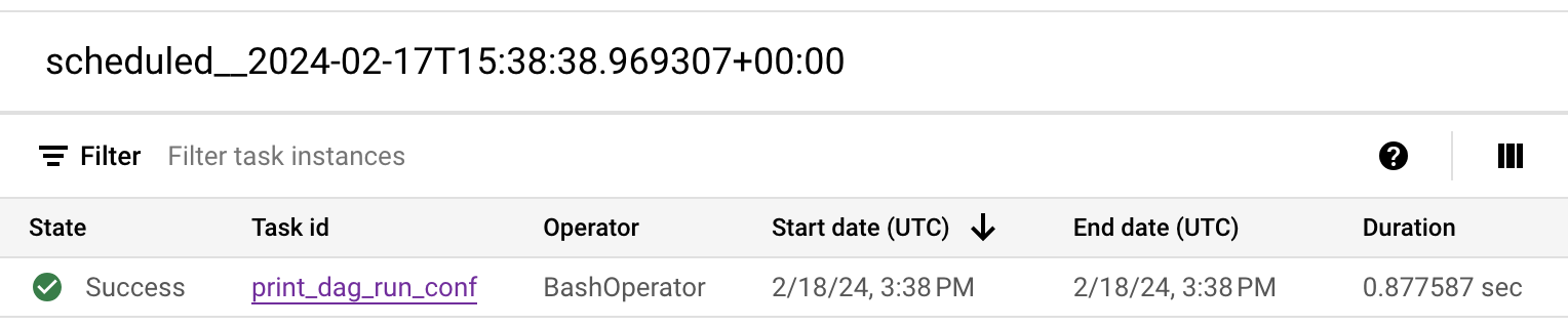 El DAG de ejemplo contiene una tarea, print_dag_run_conf, que ejecuta el comando echo