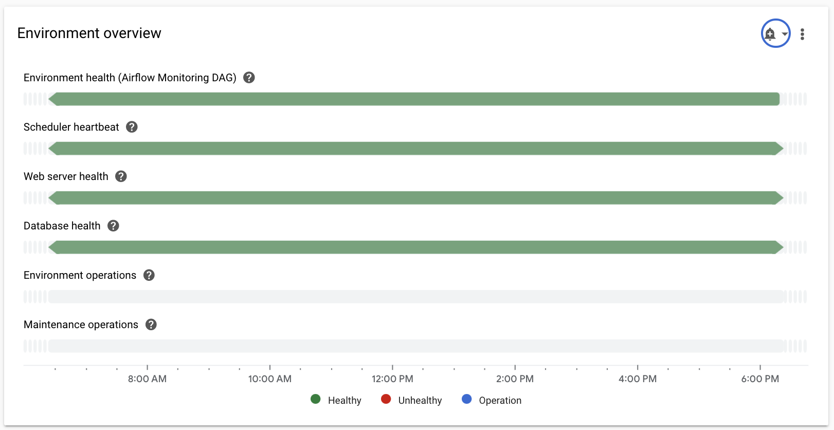 | 環境健康狀態 (Airflow 監控 DAG) | 時間軸:顯示 Composer 部署作業的健康狀態。綠色狀態只會反映 Composer 部署作業的狀態。這並不表示所有 Airflow 元件都能運作,DAG 也能執行。 |
