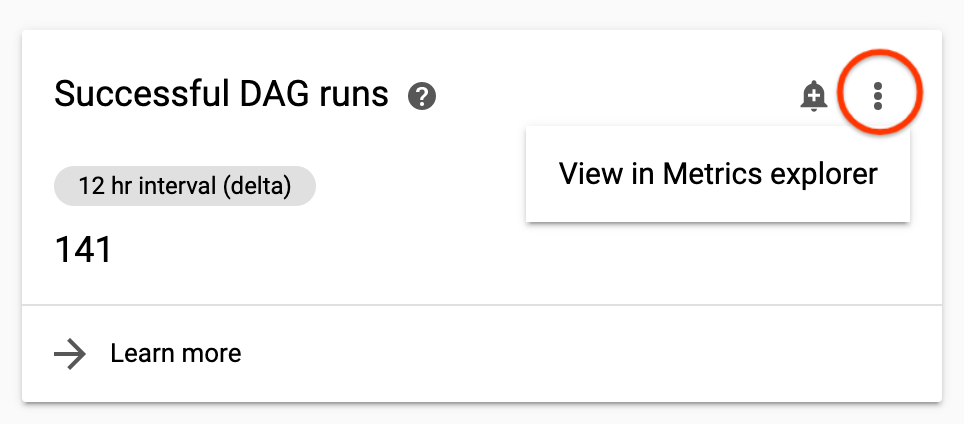 如要從 Cloud Composer 監控資訊主頁前往指標探索器,請按一下指標資訊卡右上角的三點圖示,然後選取「在指標探索器中查看」。