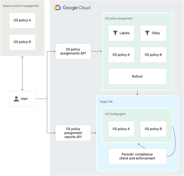 When you create a new OS policy assignment, VM Manager applies the OS policies to each VM according to the rollout configuration. During the rollout, a copy of each OS policy is placed on the VM. When you update an OS policy assignment, VM Manager checks and enforces the configuration changes for the OS policy that is on the target VM.