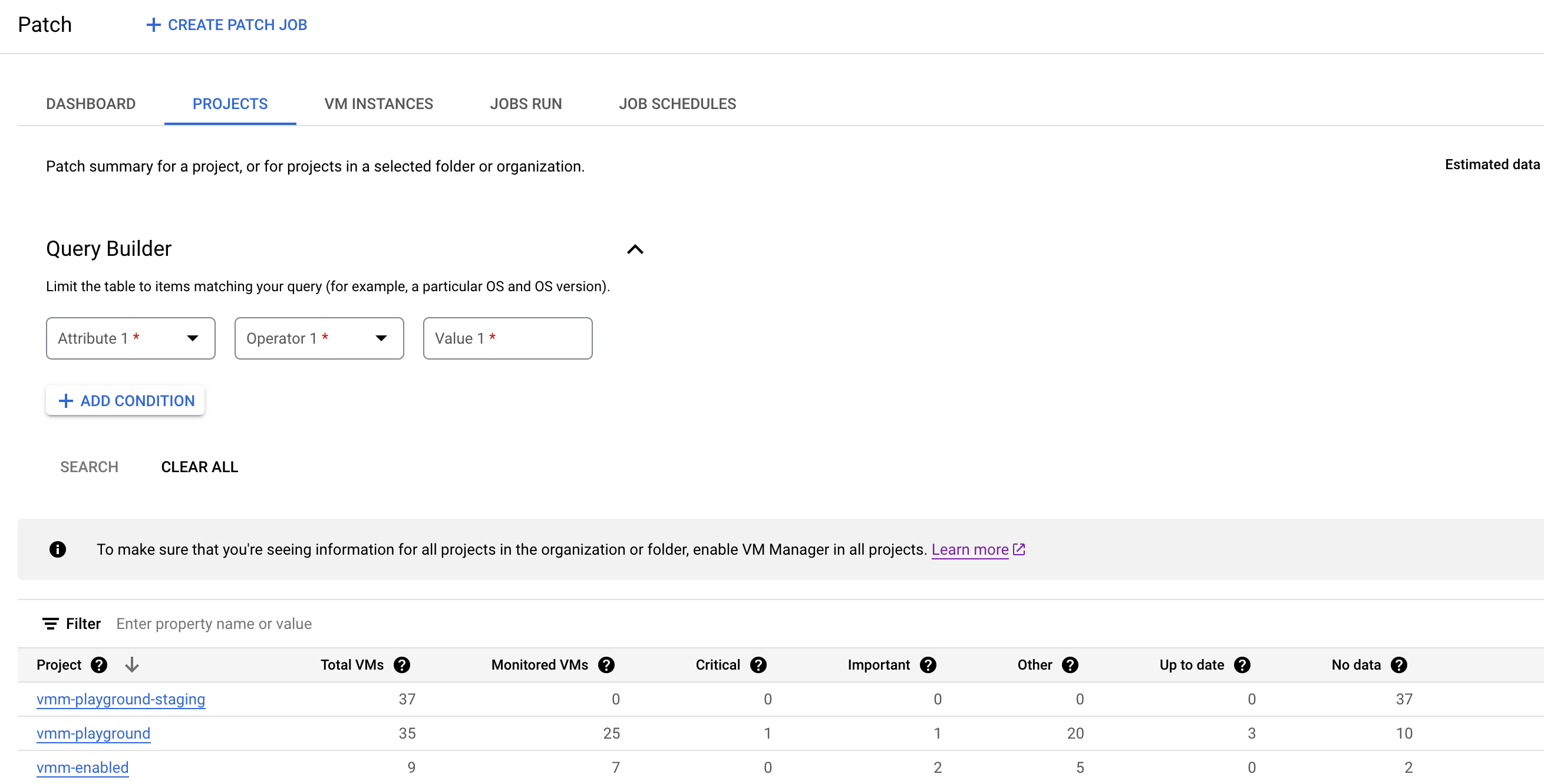 Basierend auf den Kriterien, die Sie mit dem Query Builder angeben, berechnet und zeigt VM Manager die Patchübersicht für VMs in den Projekten in Ihrer Organisation oder Ihrem Ordner an. Sie können dann die Tabellenfilter in der Tabelle mit der Patchübersicht verwenden, um die angezeigten Daten zu filtern.