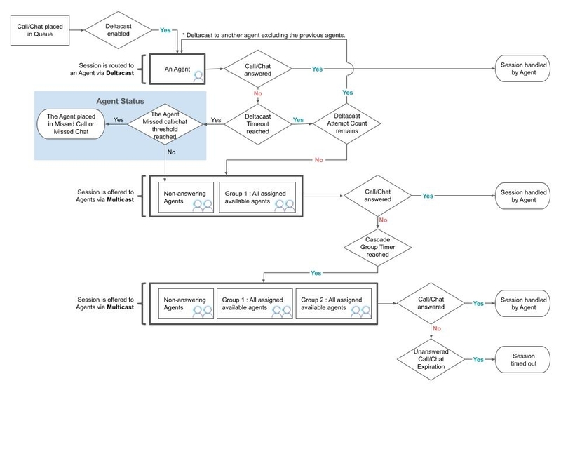 Si el agente al que se le ofrece un chat no lo acepta dentro del tiempo establecido en el parámetro de configuración de tiempo de espera de Deltacast, el chat se ofrece con Multicast. Multicast envía el chat a todos los agentes de la cola, incluido el agente que no respondió el chat a tiempo.