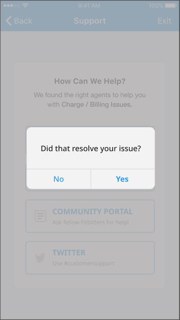 Se um consumidor clicar em Sim: o pop-up será fechado e a sessão de suporte será encerrada. O consumidor volta para a tela do app de origem onde iniciou a sessão de suporte.