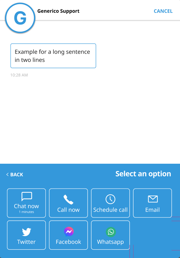 No SDK para dispositivos móveis, os links de redirecionamento externo vão aparecer abaixo das opções de chat por ligação e e-mail disponíveis. O ícone, o nome e a call-to-action são mostrados conforme configurados na página de visão geral dos links de evasão.