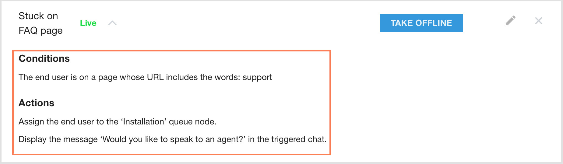 Exemplo: o acionador está definido para ser lançado quando houver um consumidor que já esteve na página, está nela há mais de 60 segundos e está em uma página que tem "help" e "Product1" no URL. Nesse caso, você precisa direcionar o consumidor direto para a fila que tem agentes de suporte prontos para ajudar com o Produto 1. A mensagem seria: "Parece que você está tentando descobrir os detalhes do Produto 1. Quer falar com um representante que pode ajudar?"