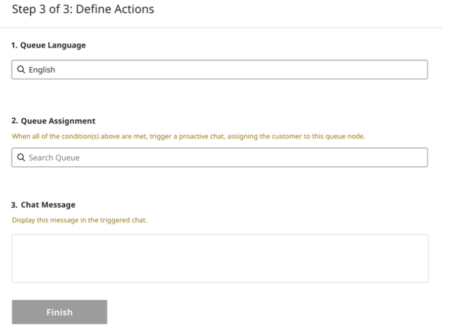 Selecione o Idioma da fila associado ao gatilho. Isso vai determinar as filas apresentadas na próxima etapa e permitir que você crie mensagens de chat no idioma dessa fila.