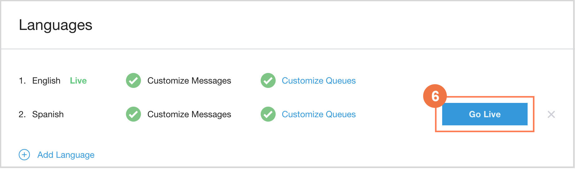 发布语言:语言可以在所有消息和队列都配置完毕之前发布,但请注意,语言一旦发布,您的消费者就可以访问。只有在您配置了所有必需的消息和队列后,才能将语言设置为正式版。 上线后,请务必通过拨打分配的号码或通过 SDK 访问队列来进行测试。