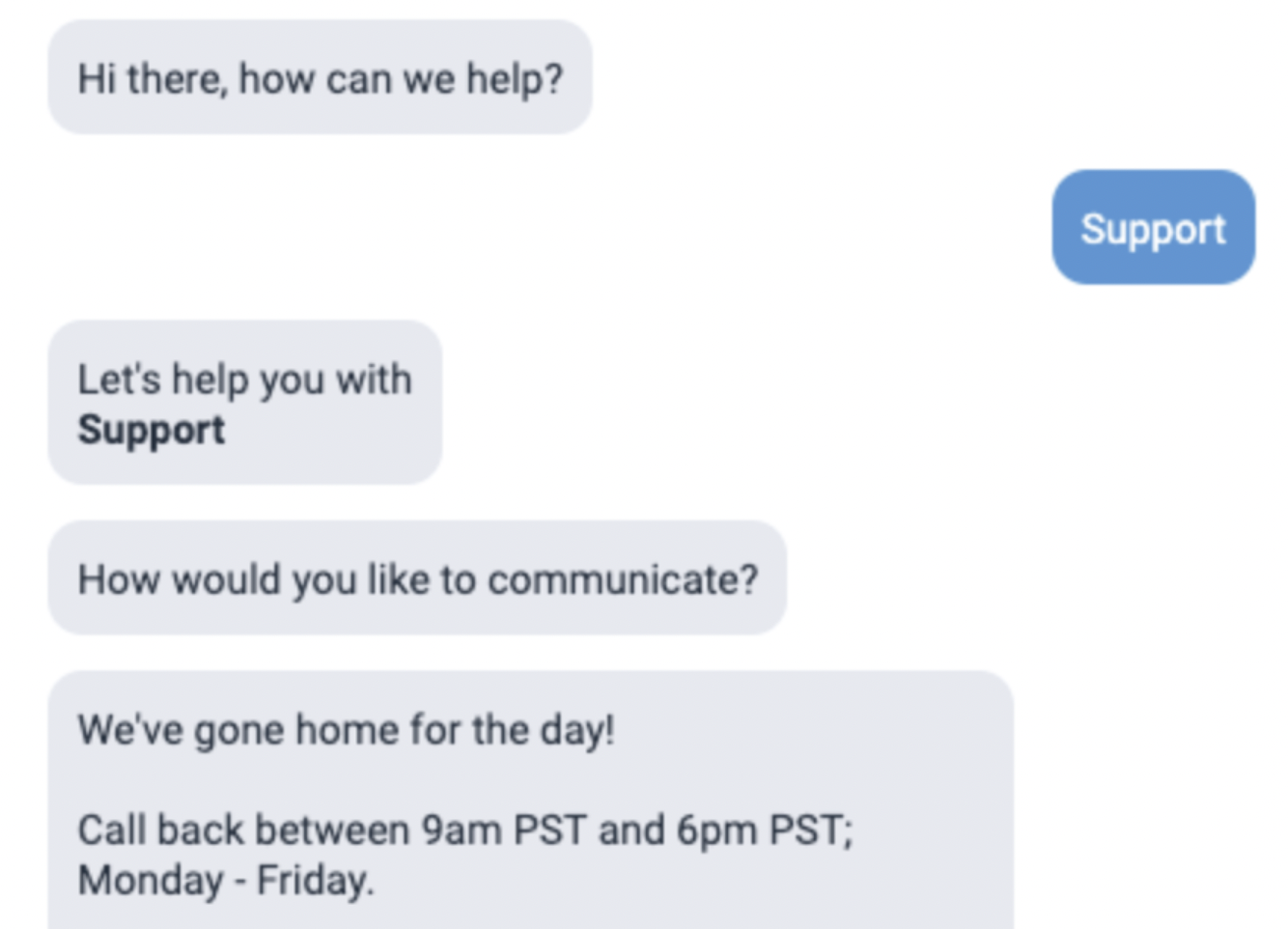 移动聊天下班后消息示例:我们今天已经下班回家了!回电时间为周一至周五上午 9 点至下午 6 点(太平洋标准时间)。