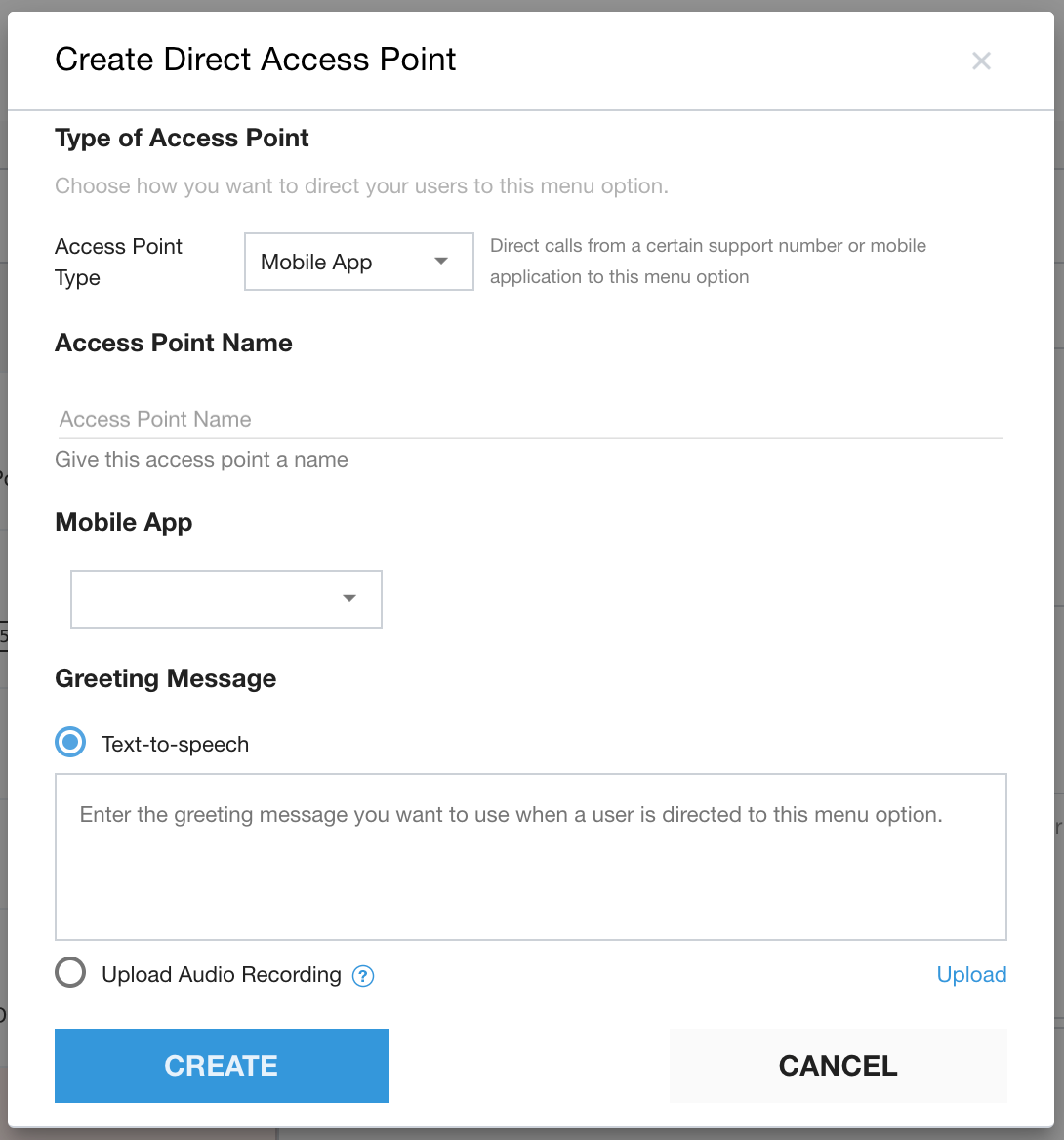 Seleziona App mobile come tipo di punto di accesso. Questa opzione è disponibile solo per i menu delle code di primo livello.