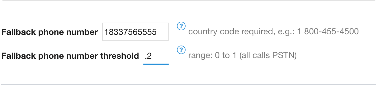 Se l'SDK mobile rileva che la connettività dati per una determinata chiamata non soddisfa la soglia minima configurata indicata di seguito, la chiamata verrà eseguita come chiamata PSTN utilizzando il numero definito qui.