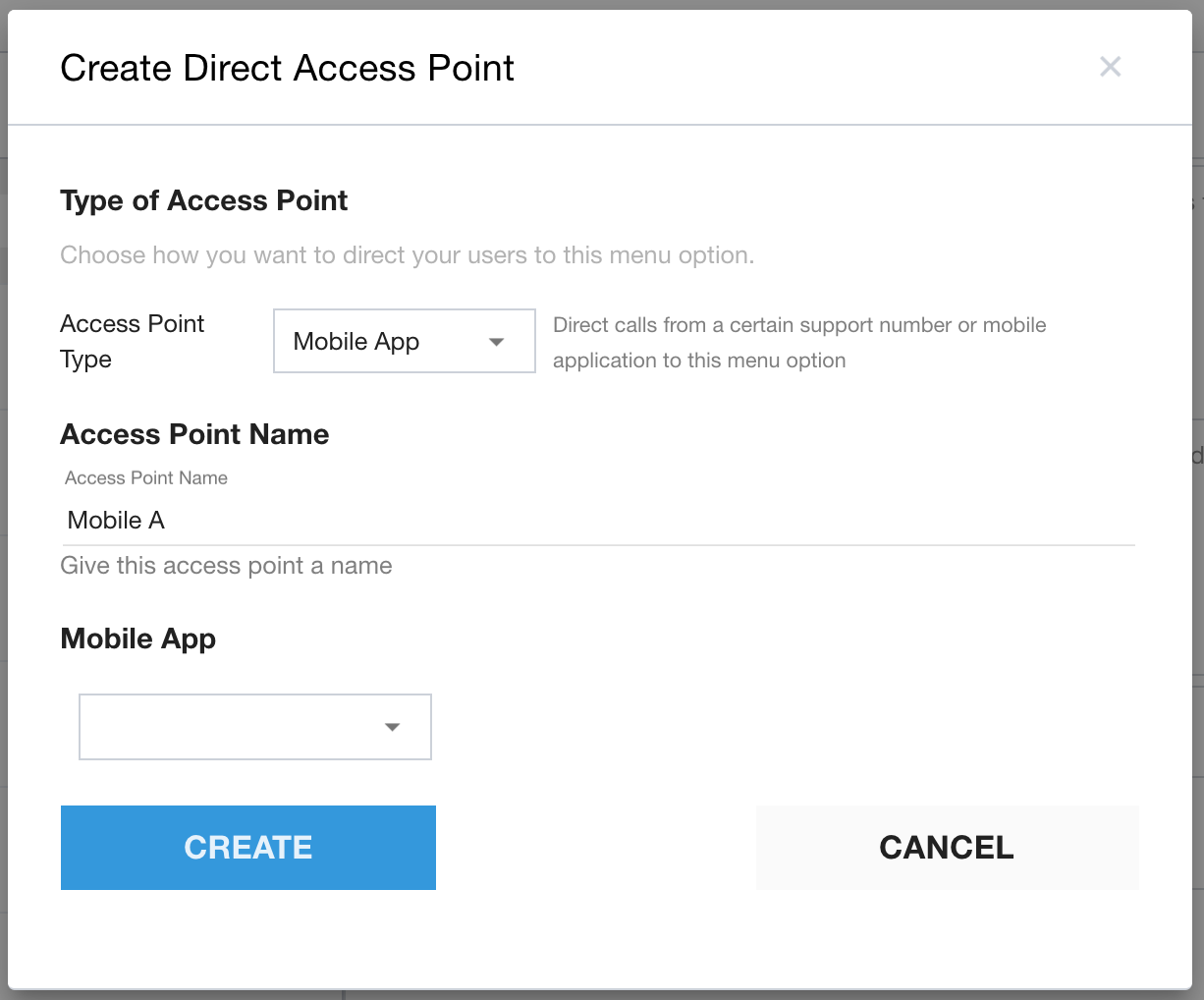 Selecione App para dispositivos móveis como o tipo de ponto de acesso. Essa opção está disponível apenas para menus de fila de nível superior.