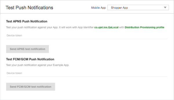 Agora você pode testar a funcionalidade de notificação push em um app para dispositivos móveis por app. Um menu suspenso permite que o admin/desenvolvedor selecione o app para dispositivos móveis específico para realizar o teste.