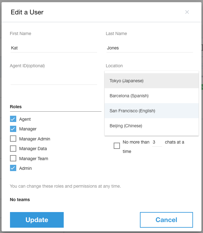 Os agentes e usuários podem ser atribuídos a um local específico. O local determina o idioma padrão do usuário.