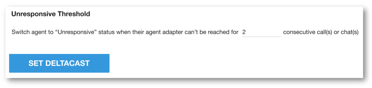 This default value of (3) is configurable in the CCAI Platform portal by going to Settings > Operation Management > Deltacast, and can be customized by specifying how many consecutive skipped calls or chats need to occur before the Agent is placed into "Unresponsive" status.