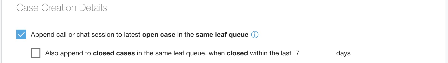 同じリーフキューで開いている最新の [CRM レコード] に通話またはチャット セッションを追加する: このオプションを選択すると、同じキュー(リーフキュー)からセッションが届いた場合に、CCAI プラットフォームで既存の開いているレコードにセッションが追加されます。