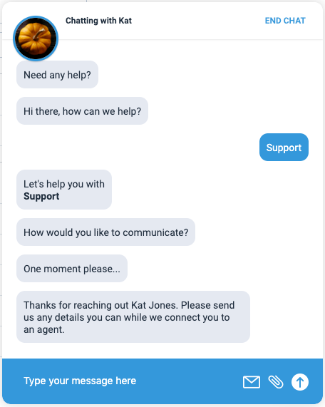 行動裝置預設訊息範例:感謝 Kat Jones 與我們聯絡。我們已為你聯絡專員,請盡可能提供詳細資訊。