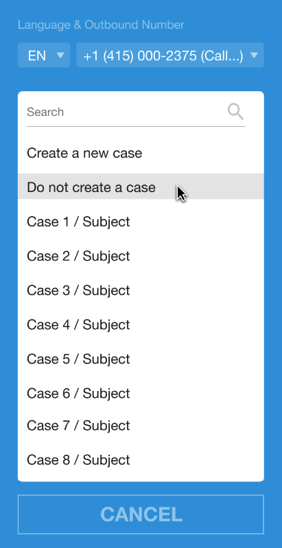 Un account specifico potrebbe avere più sedi o contatti e non tutti i numeri di telefono vengono salvati nell'account o nel contatto. In questa situazione, i tuoi agenti potrebbero dover chiamare numeri non salvati nell'account/nel contatto. Questa opzione consente a un agente di chiamare un numero non salvato nel contatto, associando comunque la richiesta al contatto. Il numero composto verrà salvato nei commenti dell'oggetto Sessione della piattaforma CCAI. Per attivare questa funzionalità, vedi Configurazione personalizzata: gestione delle operazioni.