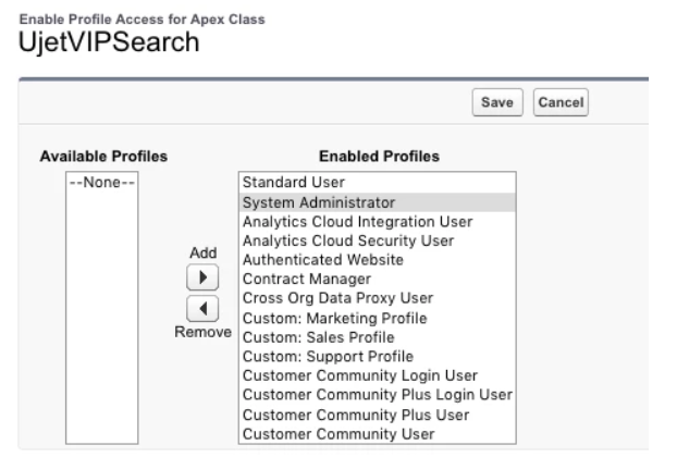 Poiché la classe Apex REST verrà accessibile dal token OAuth dell'agente, dovrai aggiungere tutti i profili agente applicabili nella colonna "Profili abilitati".