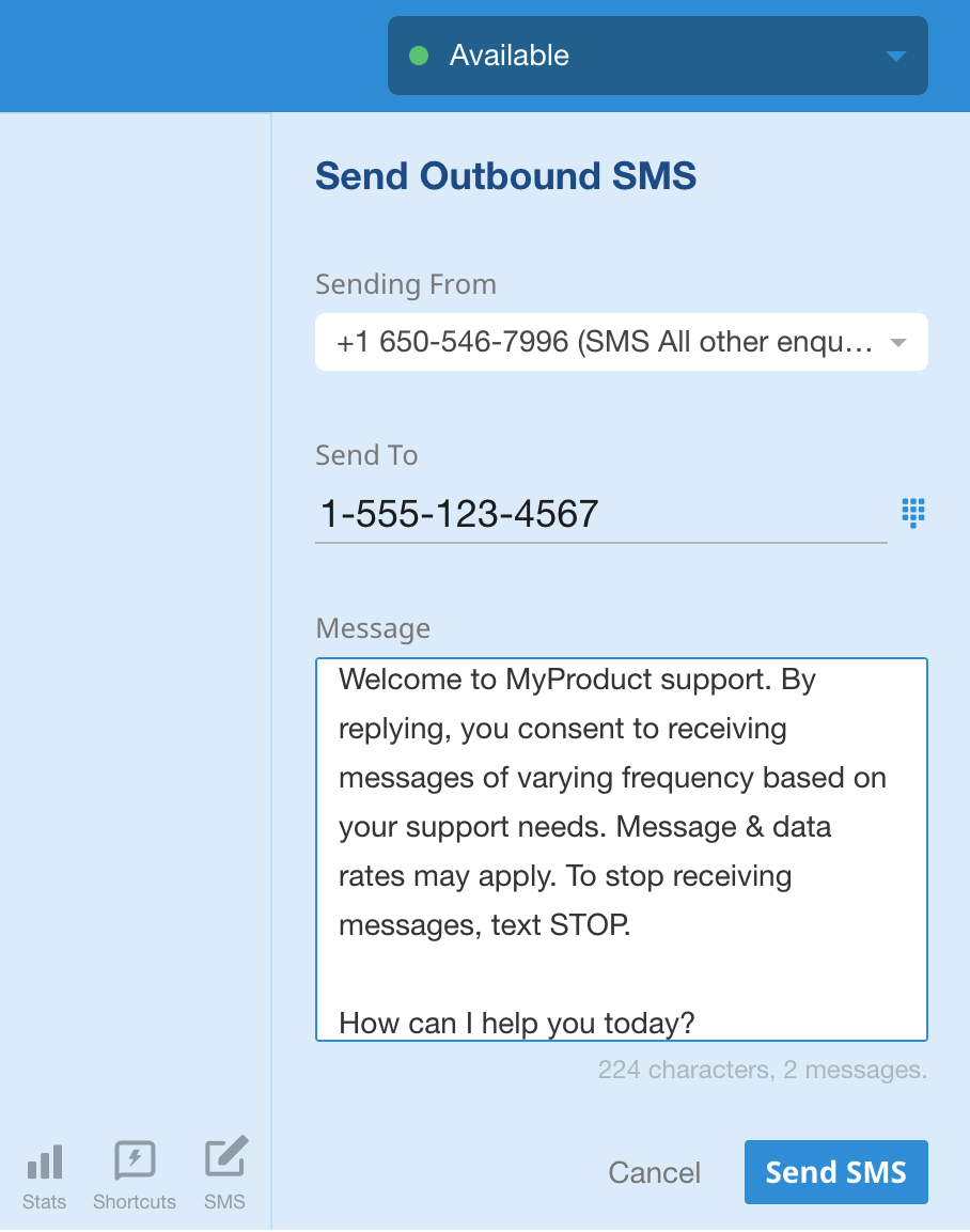 Lorsque vous utilisez les SMS sortants, il est impératif que les agents envoient un message d'activation avant d'envoyer tout autre texte au client. Pour ce faire, la méthode la plus simple consiste à utiliser un raccourci de chat. Dans cet exemple, l'agent saisit /sms pour envoyer un message d'activation standard :