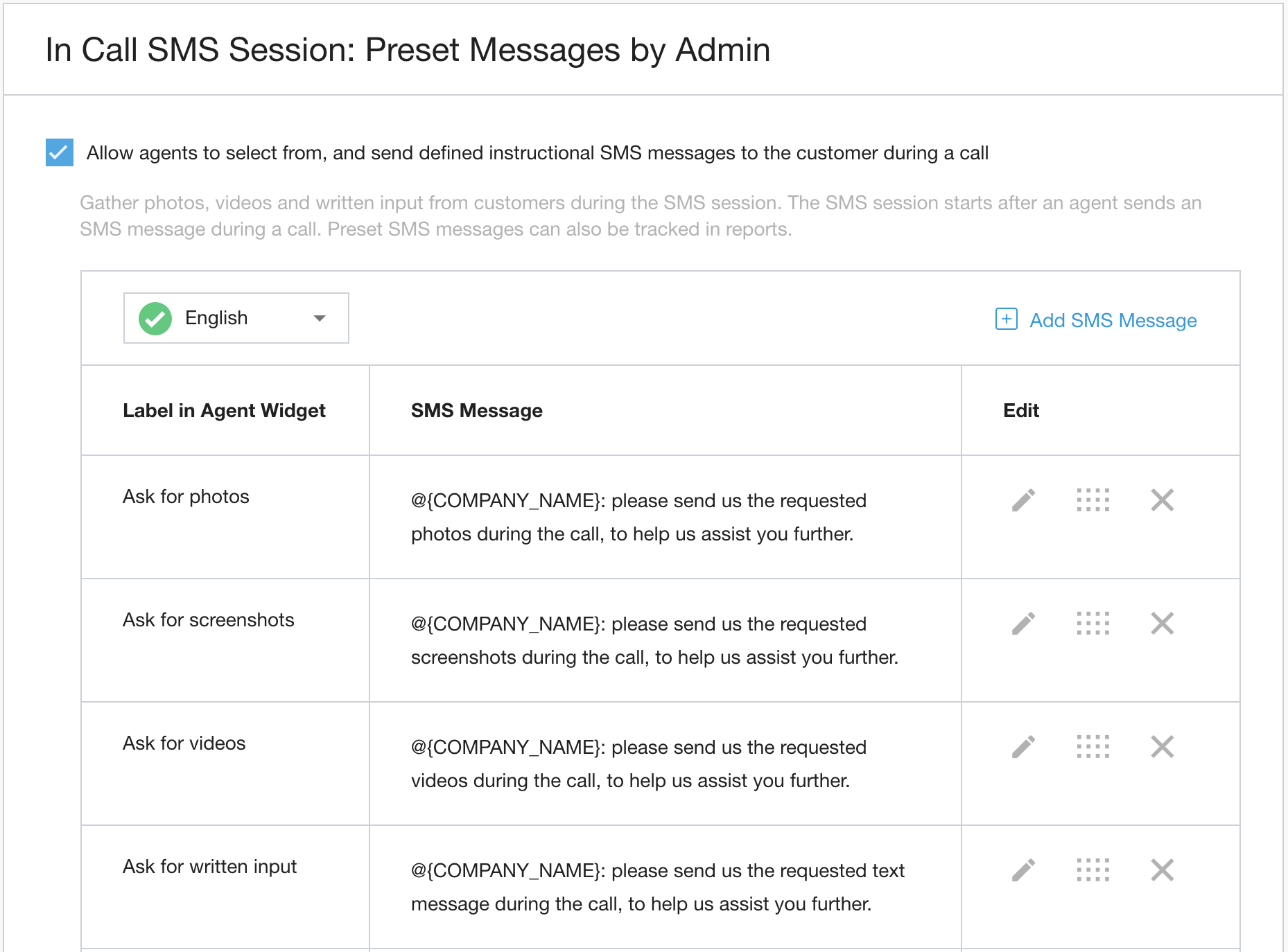 除了管理员设置的消息之外,代理还可以在短信交流过程中创建自己的基于文本的消息。如需启用此功能,请选中相应复选框,然后点击设置。