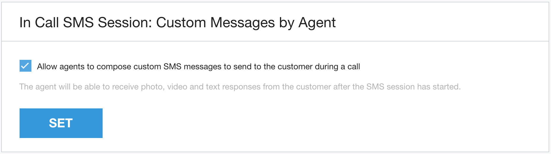 상담사는 관리자가 설정한 메시지 외에도 SMS 교환 중에 자체 텍스트 기반 메시지를 만들 수 있습니다. 이 기능을 사용 설정하려면 체크박스를 선택하고 설정을 클릭합니다.