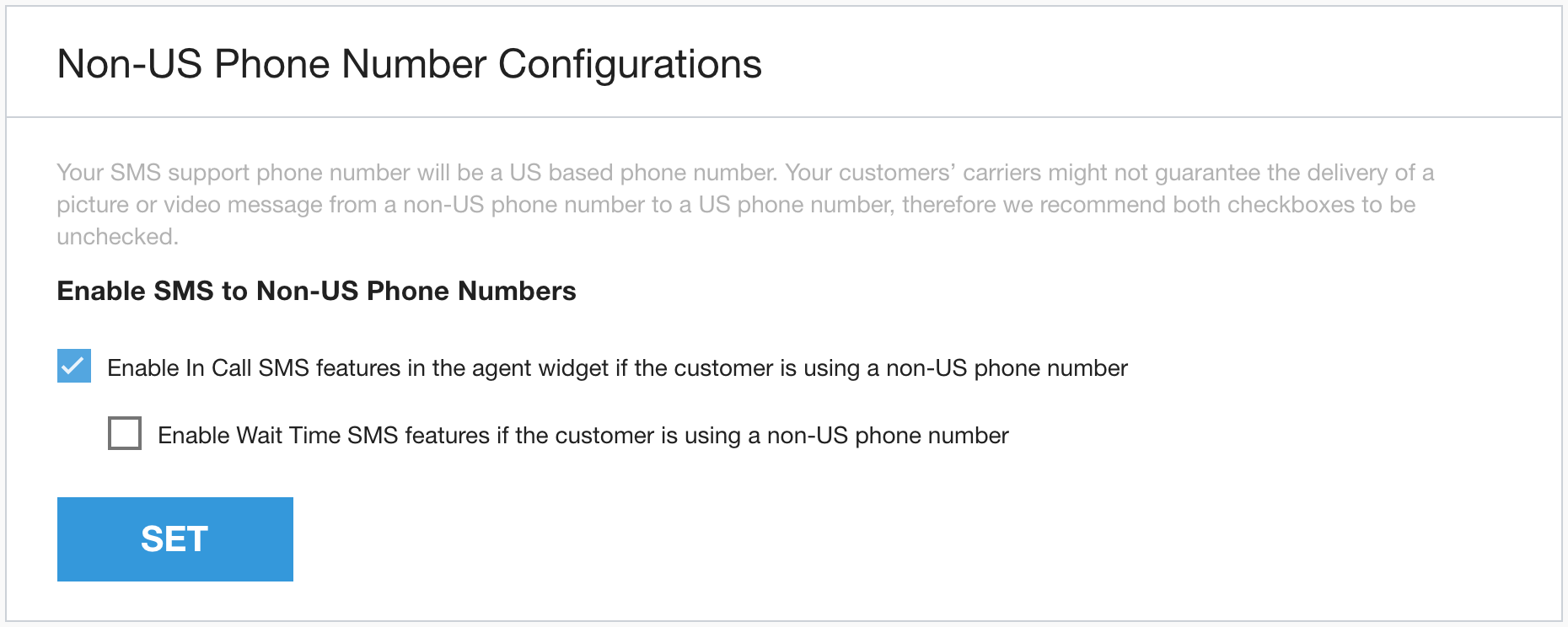 如 CCAI Platform 门户中所述,根据全球运营商的独特设置,向非美国号码发送消息时可能会发生冲突。由于 CCAI 平台无法了解或预测兼容性,因此您可以选择为非美国号码启用或停用此功能。