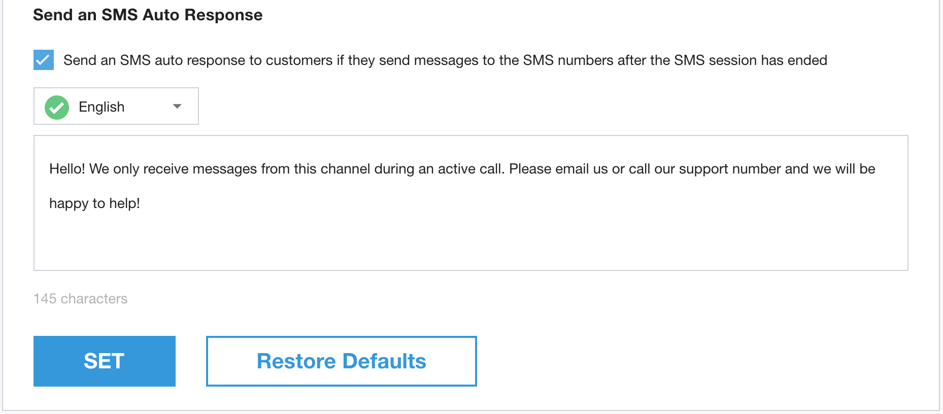 点击复选框以启用短信自动回复功能,然后选择语言。此消息可避免来电者在通话结束后尝试开始新对话或继续现有对话时可能出现的任何困惑。