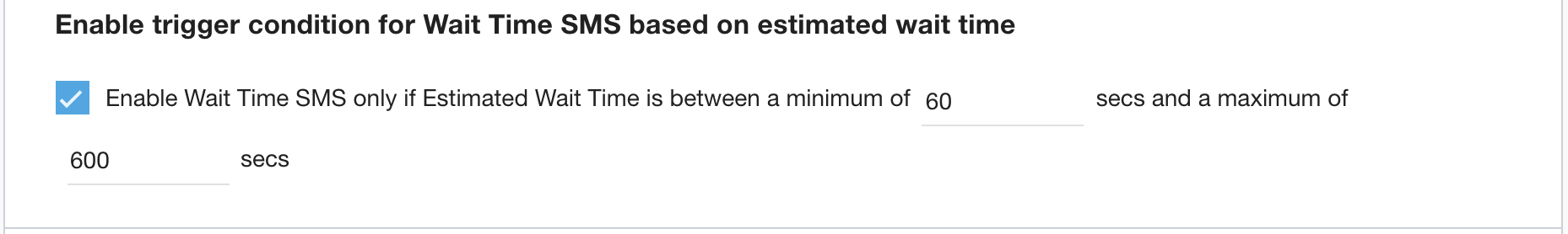 Para controles mais específicos de quando os autores da chamada devem receber a opção de usar o SMS de tempo de espera, clique na caixa para ativar a opção. Em seguida, defina o tempo mínimo e máximo de espera que precisa ser alcançado, com base no tempo estimado para que o autor da chamada ouça a opção de usar o SMS de tempo de espera.