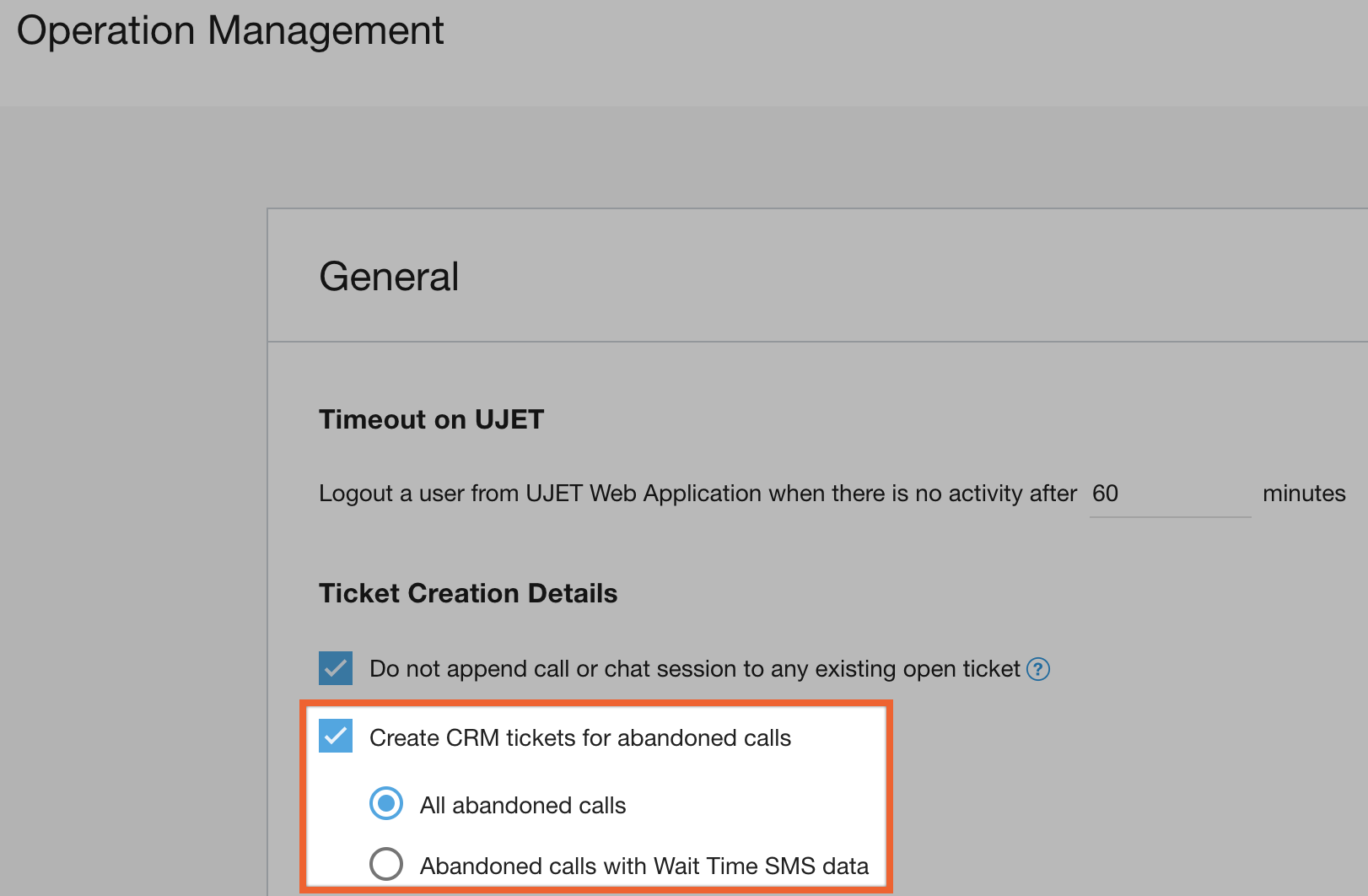 Per attivare la creazione di ticket o richieste per le chiamate abbandonate solo quando è stato ricevuto un SMS, seleziona la casella accanto a Crea ticket CRM per le chiamate abbandonate e anche Chiamate abbandonate con dati SMS.