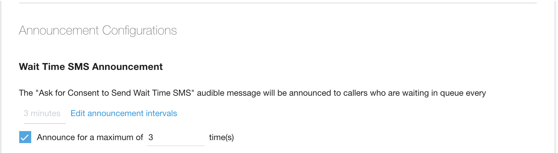 L'intervallo di riproduzione del messaggio di consenso all'invio di SMS con il tempo di attesa si basa sull'impostazione dell'annuncio globale. Fai clic su Modifica intervalli di annuncio per andare alla pagina Impostazioni chiamate. Questa impostazione è chiamata Intervalli di annuncio del chiamante universale.