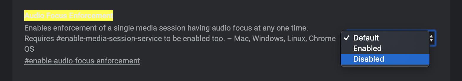 解決策: chrome://flags/#enable-audio-focus-enforcement に移動し、[音声フォーカスの強制] 設定を [無効] に変更します。