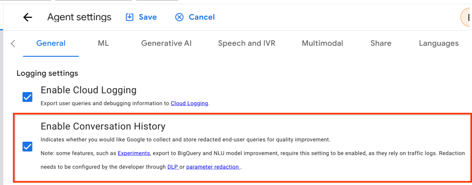 - Verifique se o agente de serviço do Customer Experience Insights tem as permissões para buscar conversas do Dialogflow. Essa opção fica ativada por padrão. Volte a esta etapa se as conversas não aparecerem.