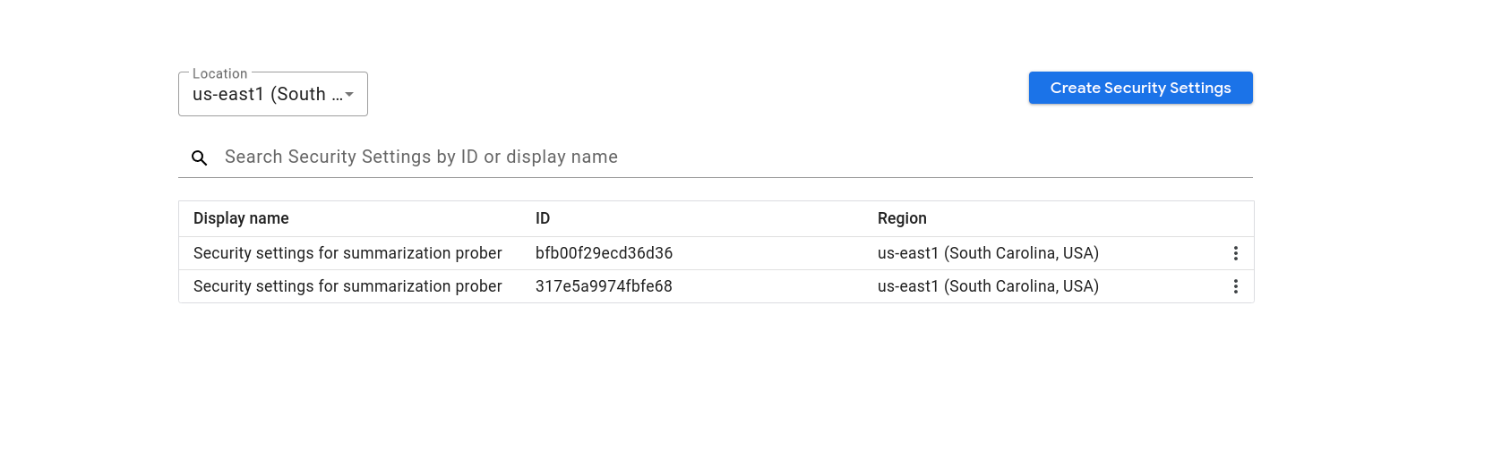 Create or update existing security settings in the correct region.