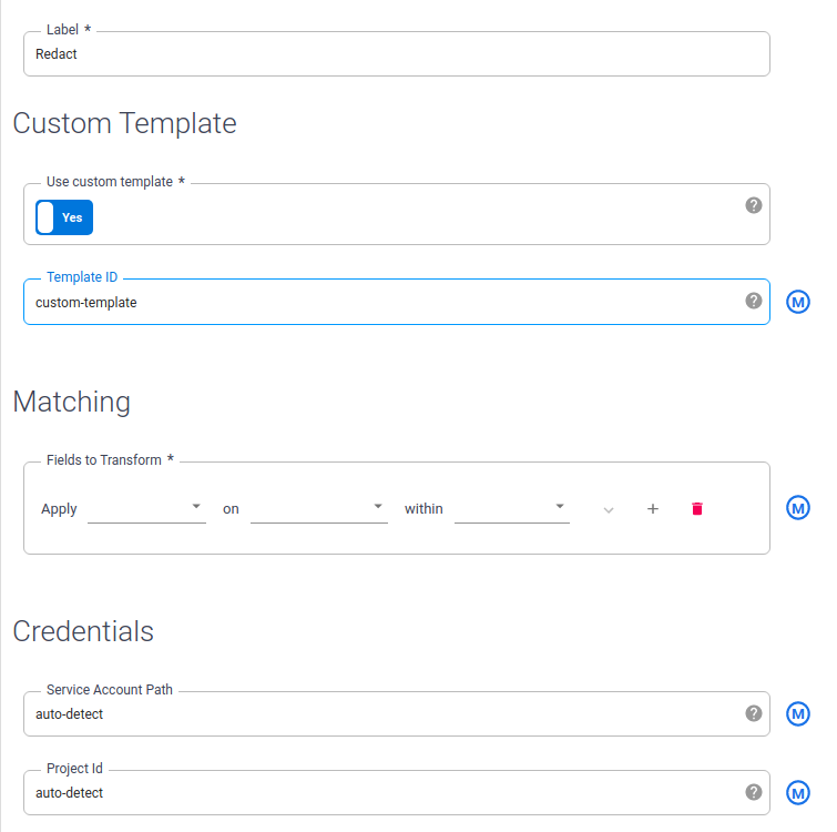返回 Cloud Data Fusion 網頁版 UI,在「Redact properties」(遮蓋屬性) 選單的「Template ID」(範本 ID) 下方,輸入您建立的自訂範本範本 ID。