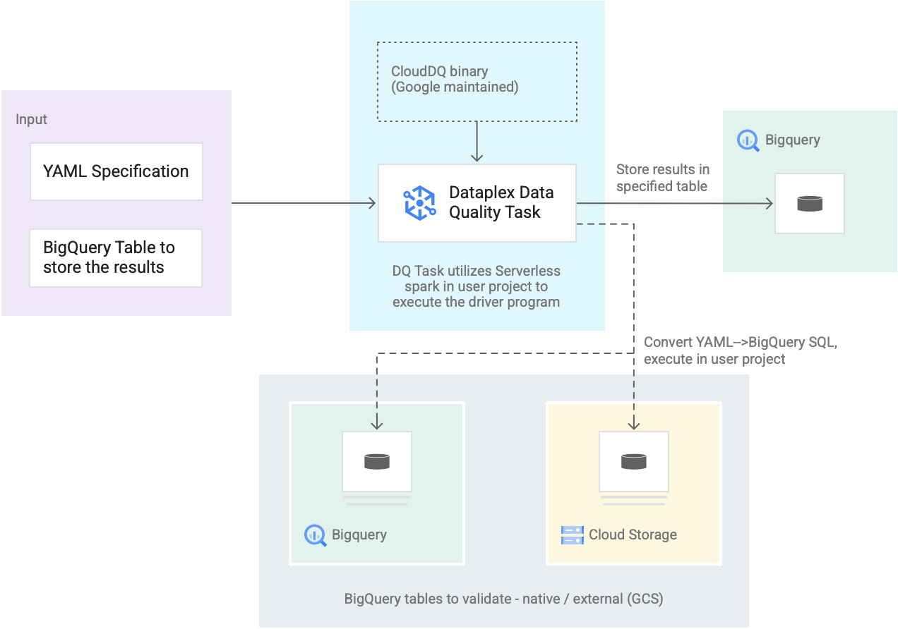 - Tarefa de qualidade de dados do Dataplex Universal Catalog: uma tarefa de qualidade de dados do Dataplex Universal Catalog é configurada com um binário PySpark do CloudDQ pré-criado e mantido, e usa a especificação YAML e a tabela de resultados do BigQuery como entrada. Semelhante a outras tarefas do catálogo universal do Dataplex, a tarefa de qualidade de dados do catálogo universal do Dataplex é executada num ambiente do Spark sem servidor, converte a especificação YAML em consultas do BigQuery e, em seguida, executa essas consultas nas tabelas definidas no ficheiro de especificação.