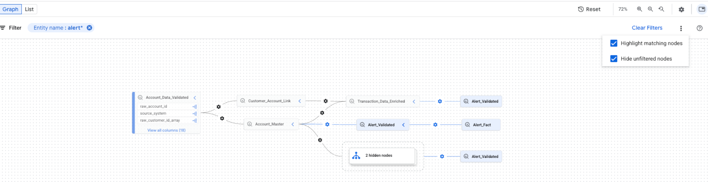 Graph view: displays lineage as an interactive graph, letting you explore relationships between data assets and columns by expanding nodes.
