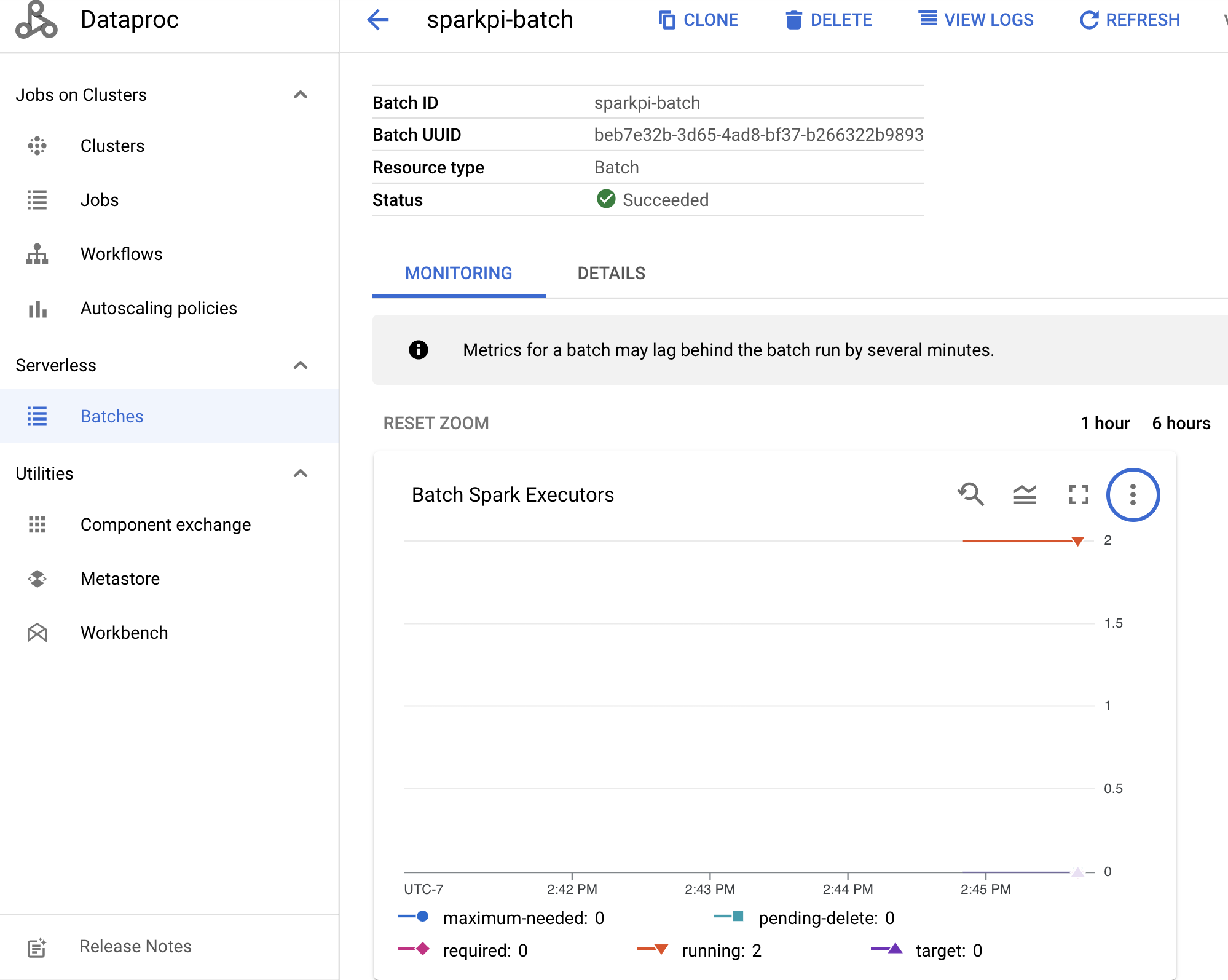 Batch 指標を表示するには、コンソールの Dataproc の [**バッチ**] ページでバッチ ID をクリックし、バッチの [**詳細**] ページを開きます。 このページには、[**モニタリング タブ**] の下にバッチ ワークロードの指標グラフが表示されます。Google Cloud
