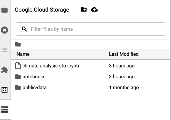 Per accedere al browser Cloud Storage, fai clic sull'icona del browser Cloud Storage nella barra laterale della pagina Launcher di JupyterLab, quindi fai doppio clic su una cartella per visualizzarne i contenuti.