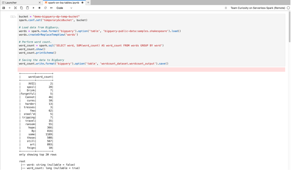 BigQuery SQL: The BigQuery Spark connector allows your notebook code to load data from BigQuery tables, perform analysis in Spark, and then write the results to a BigQuery table.